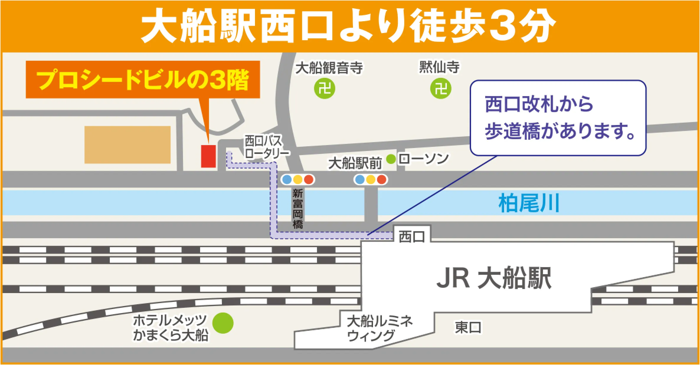 路線が豊富で便利な大船駅西口から徒歩3分の好立地。穏やかな雰囲気を感じるオレンジ色のビルの3階にあります。お気軽にお越しください。